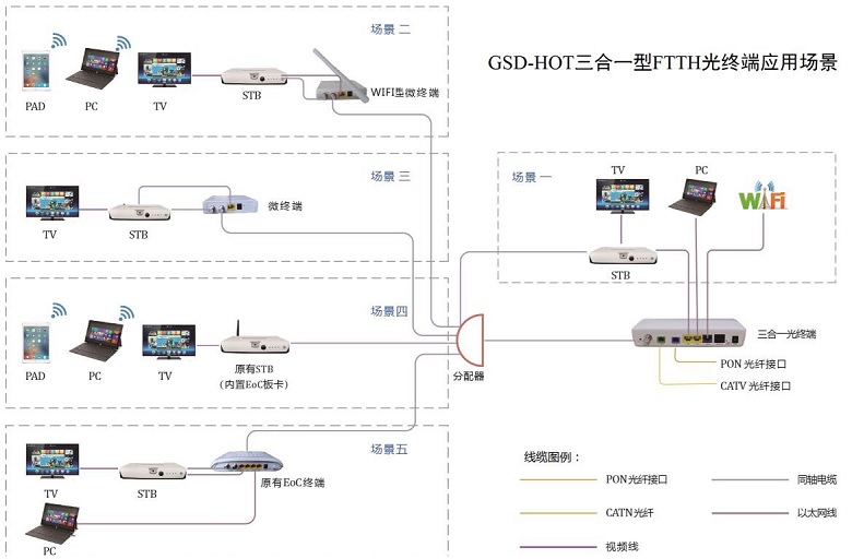 GSD-HOT 三合一型 FTTH 光終端是一款內(nèi)置了 CATV 及 ONU 光模塊和同軸電纜調(diào)制解調(diào)模塊的無源光網(wǎng)絡(luò)終端。該產(chǎn)品基于成熟穩(wěn)定的 EPON 技術(shù),并融合了千兆以太網(wǎng)交換技術(shù)和同軸電纜網(wǎng) EoC 技術(shù),不僅系統(tǒng) 可靠性高,而且組網(wǎng)部署方便,為 FTTH 網(wǎng)絡(luò)光纖入戶后駁接室內(nèi)原有的同軸電纜網(wǎng)絡(luò)提供了一個(gè)便捷的 解決方案,使原有的 EOC 網(wǎng)絡(luò)設(shè)備(包括 EOC 終端和內(nèi)置 EOC 模塊的雙向機(jī)頂盒)在不做任何改動(dòng)的 情況下,就能方便地接入新建的 FTTH 網(wǎng)絡(luò),并能同時(shí)支持寬帶上網(wǎng)和 VOD 點(diǎn)播等多個(gè)業(yè)務(wù)。